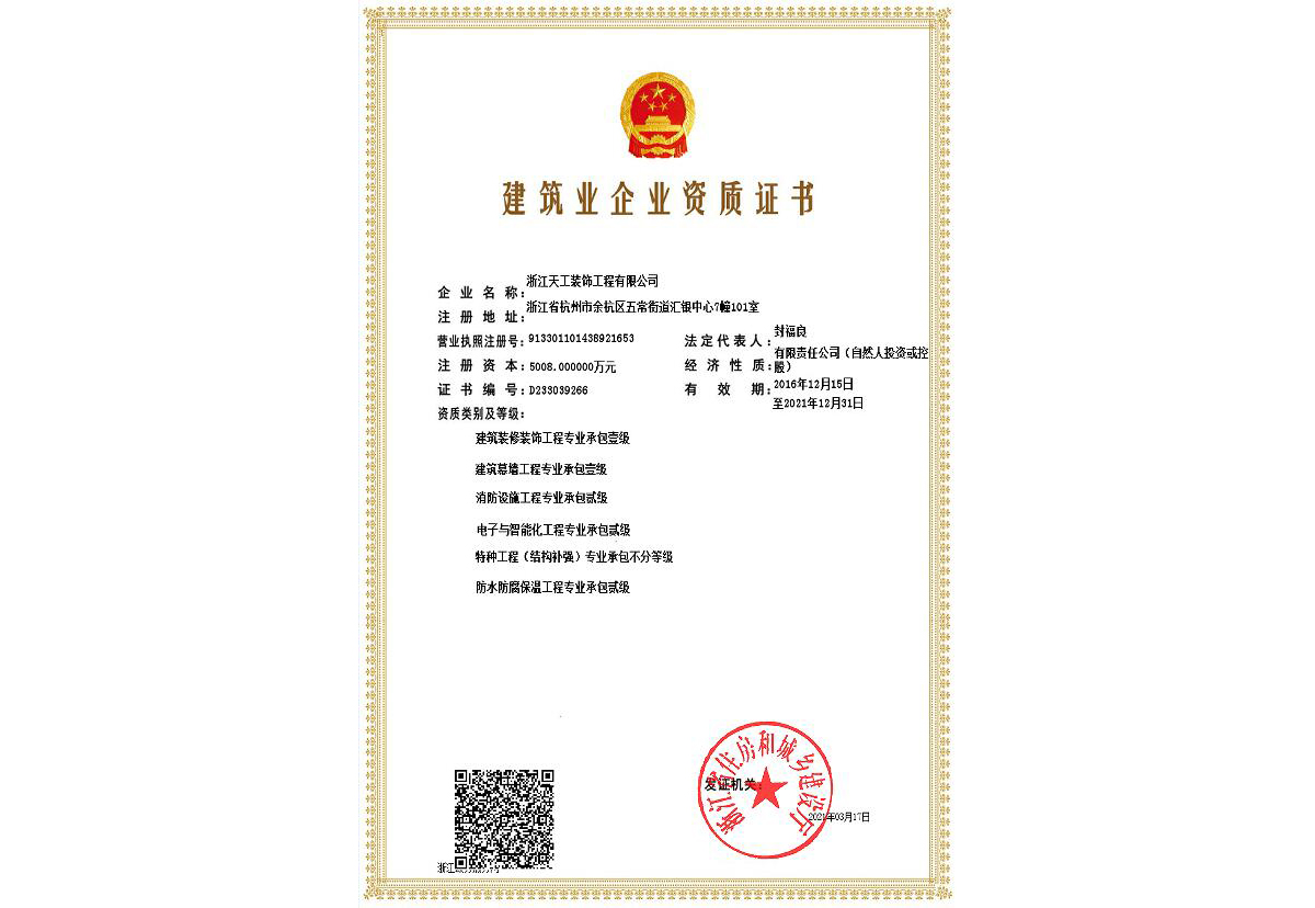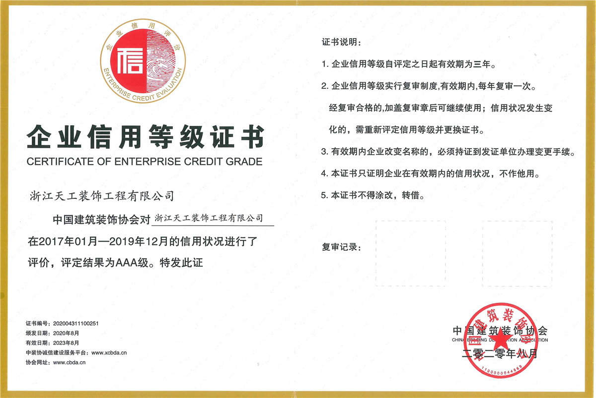 浙江天工裝飾工程有限公司成立于1994年,是一家專注于建筑行業近三十年,余杭區內規(guī)模最大、最專業的現代化專業承包企業,連續(xù)十二年榮獲“余杭區建筑業十強企業”稱號。公司現任余杭區建筑裝飾行業協會會長單位、杭州市建筑裝飾行業協會副會長單位、浙江省建筑裝飾行業協會副會長單位、中國建筑裝飾協會理事單位。公司具備建筑裝修裝飾工程專業承包壹級、建筑幕墻工程專業承包壹級、建筑裝飾工程設計專項甲級、建筑幕墻工程設計專項甲級、展覽陳列工程設計施工一體化貳級、電子與智能化工程專業承包貳級、消防設施工程專業承包貳級、防水防腐保溫工程專業承包貳級,集建筑工程施工總承包、建筑機電安裝、城市及道路照明、鋼結構、結構補強、安防施工等多項資質。主要從事大型公共建筑、星級酒店的室內精裝修、建筑幕墻及建筑智能化工程的設計與施工。 天工裝飾始終把建筑裝飾當作一項 “美的事業”,在施工中嚴把質量關,不斷規(guī)范和提升工程技術標準。近年來,公司承建的浙商開元名都國際酒店I標段裝飾工程、杭州藝尚雷迪森廣場酒店裝修工程、余杭區時代廣場5號樓(市民之家)室內裝飾工程、永安之星室內裝飾工程、青山湖科技城創(chuàng)業廣場裝修工程、杭州未來科技城醫(yī)院室內裝飾工程、杭州師范大學附屬實驗學校裝修工程、杭州老板電器股份有限公司辦公樓裝飾工程、深川控股集團綜合樓幕墻工程、浙江省科技信息研究院幕墻工程、北航杭州創(chuàng)新研究院(余杭)內裝及智能化提升改造項目(研究生院)工程、臨平新城人才服務中心設計釆購施工(EPC)工程總承包項目、浙江大學先進電氣裝備創(chuàng)新中心室內外裝飾及改造項目設計采購施工(EPC)工程總承包項目等,先后獲得“中國建筑工程裝飾獎”、“全國建筑裝飾科技創(chuàng)新獎”、浙江省建設工程“錢江杯”優(yōu)質工程獎、杭州市建設工程“西湖杯”優(yōu)質工程獎、嘉興市建設工程“南湖杯”優(yōu)質工程獎、“浙江省優(yōu)秀建筑裝飾工程獎”、“浙江省優(yōu)質安裝質量獎”等榮譽。 天工裝飾恪守“誠實守信、文明經營”,近年來公司得到了客戶的信賴也獲得了業界的好評,先后被評為“國家級守合同重信用單位”、“全國建筑裝飾行業AAA級信用企業”、“全國百家科技創(chuàng)新型企業”、“浙江省AAA級守合同重信用單位”、“人民銀行信用等級AAA級企業”、“浙江省信用管理示范企業”、“浙江省誠信企業”、“浙江省建筑裝飾行業強優(yōu)企業”、“杭州市建筑業優(yōu)秀企業”、“余杭區建筑業十強企業”、 “余杭區人民政府質量獎”等榮譽。